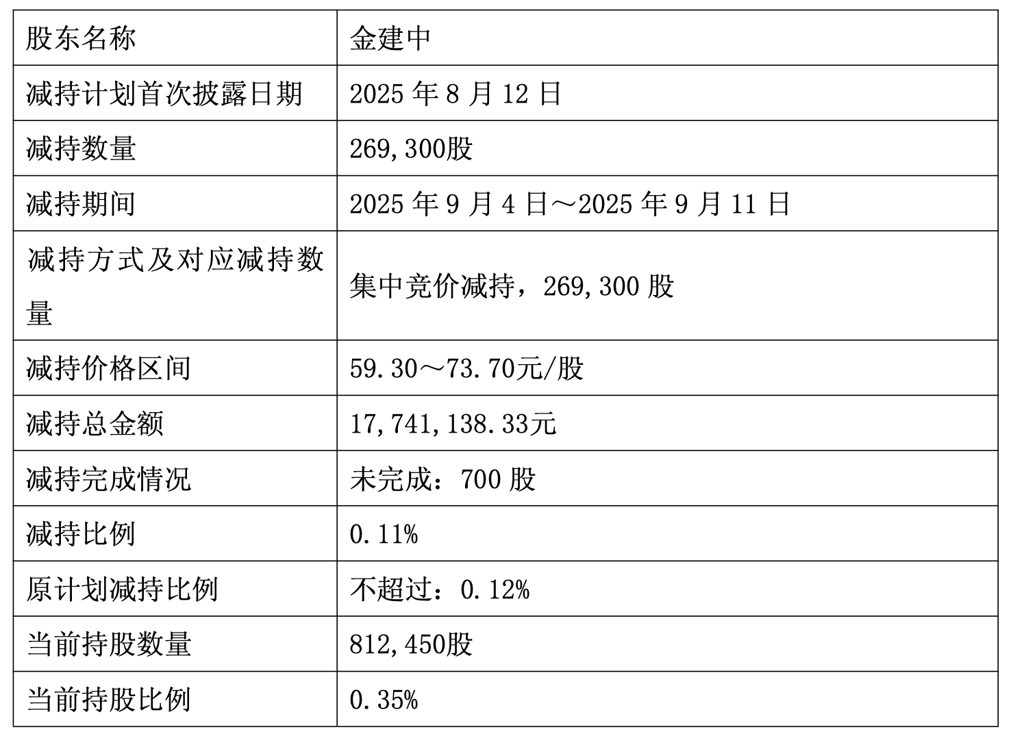 金建中通过集中竞价累计减持公司股份26.93万股,占公司总股本的0.11%,剩余700股未完成减持,减持总金额为1774.11万元。