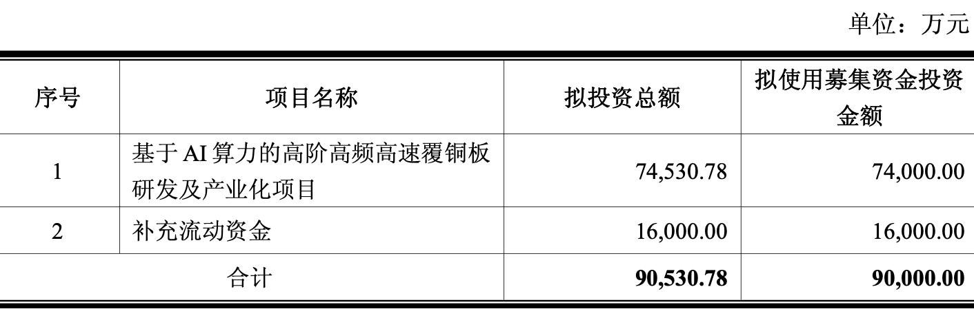 具体来看,建设基于AI算力的高阶高频高速覆铜板研发及产业化项目预计总投资7.45亿元,拟使用募集资金投资7.4亿元,规划建设期24个月,第三年开始试生产,至第五年达产。