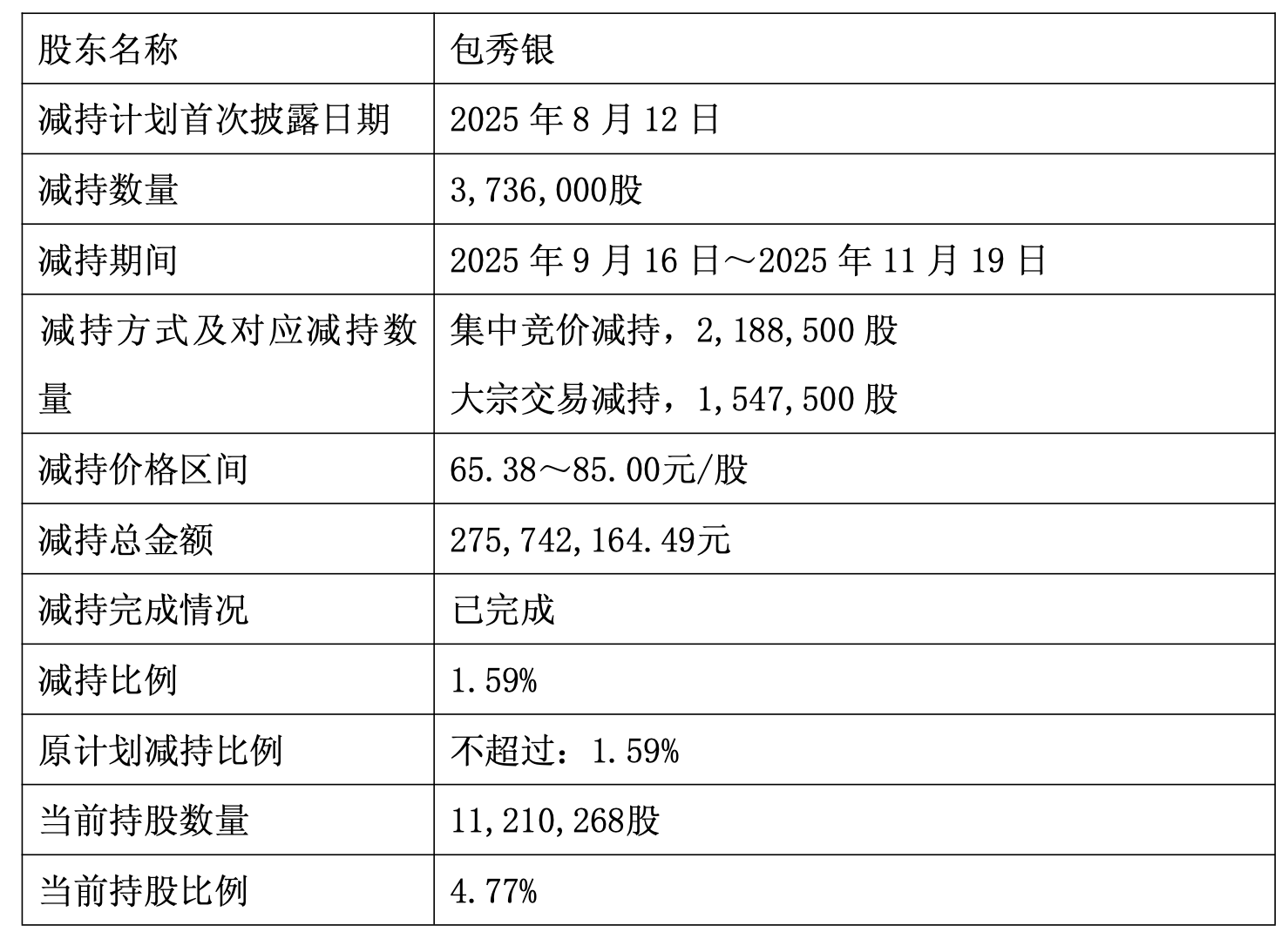 根据公告,包秀银通过集中竞价及大宗交易方式累计减持公司股份373.6万股,占公司总股本的1.59%,减持总金额为2.76亿元。