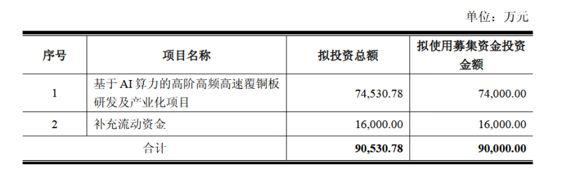 根据定增预案,此次发行股票数量不超过7043.13万股,募集资金总额不超过9亿元,具体包括:7.4亿元用于基于AI算力的高阶高频高速覆铜板研发及产业化项目,1.6亿元用于补充流动资金。