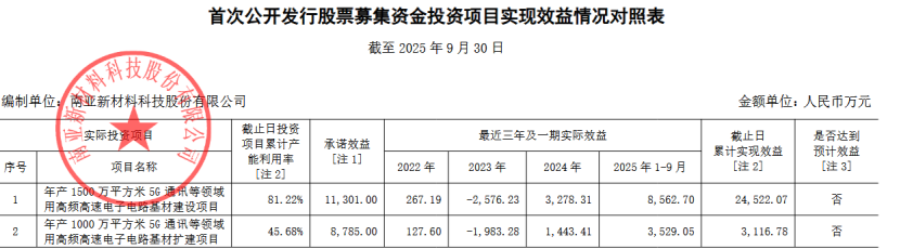 公司年产1000万平方米5G通讯等领域用高频高速电子电路基材扩建项目主要生产线于2022年10月转固,截止目前,该项目累计产能利用率为45.68%,累计实现效益3116.78万元,低于该期间累计承诺效益16186.92万元。
