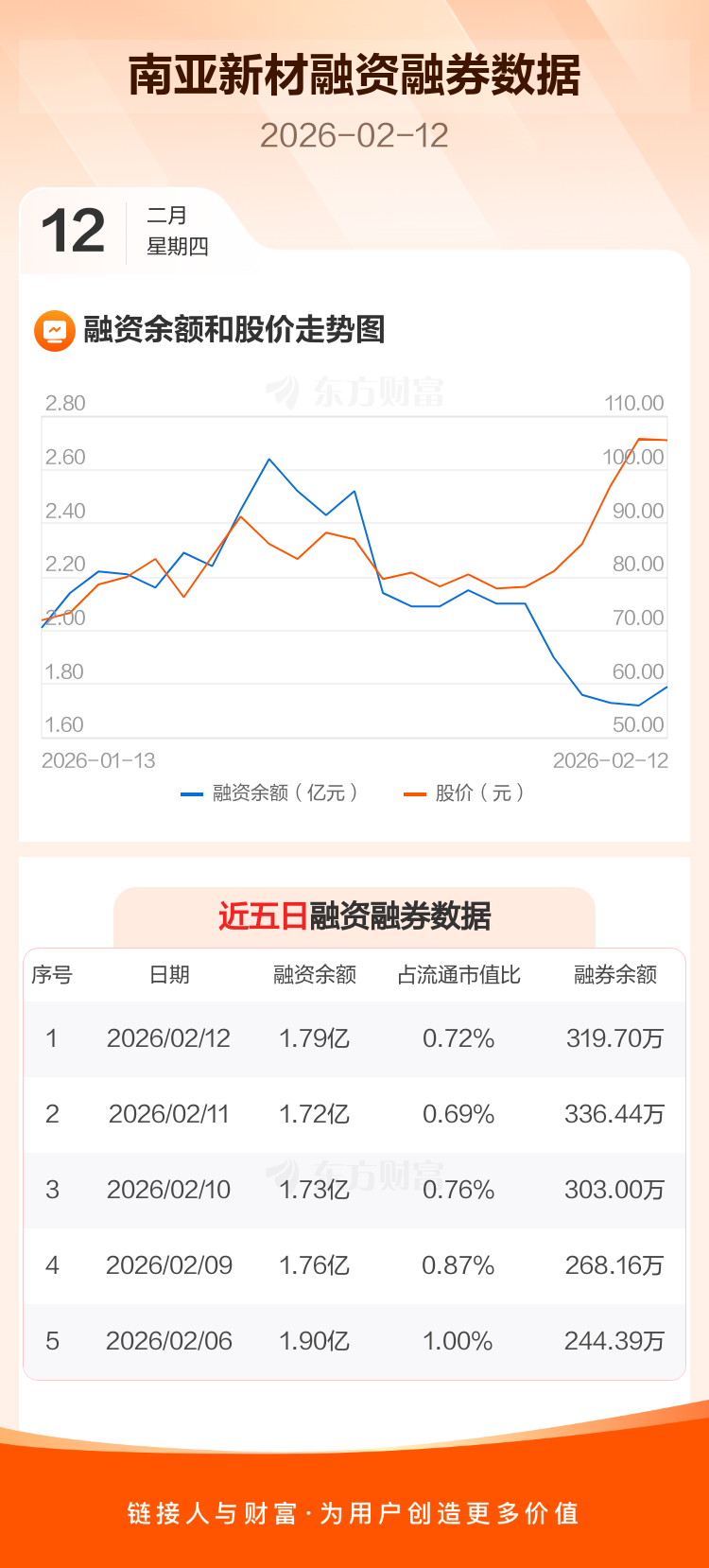 交易所最新数据显示,南亚新材于2026年2月12日获融资买入7203.02万元,融资偿还6510.05万元,当日融资净买入692.97万元。目前,该股融资余额1.79亿,占流通市值比例为0.72%。