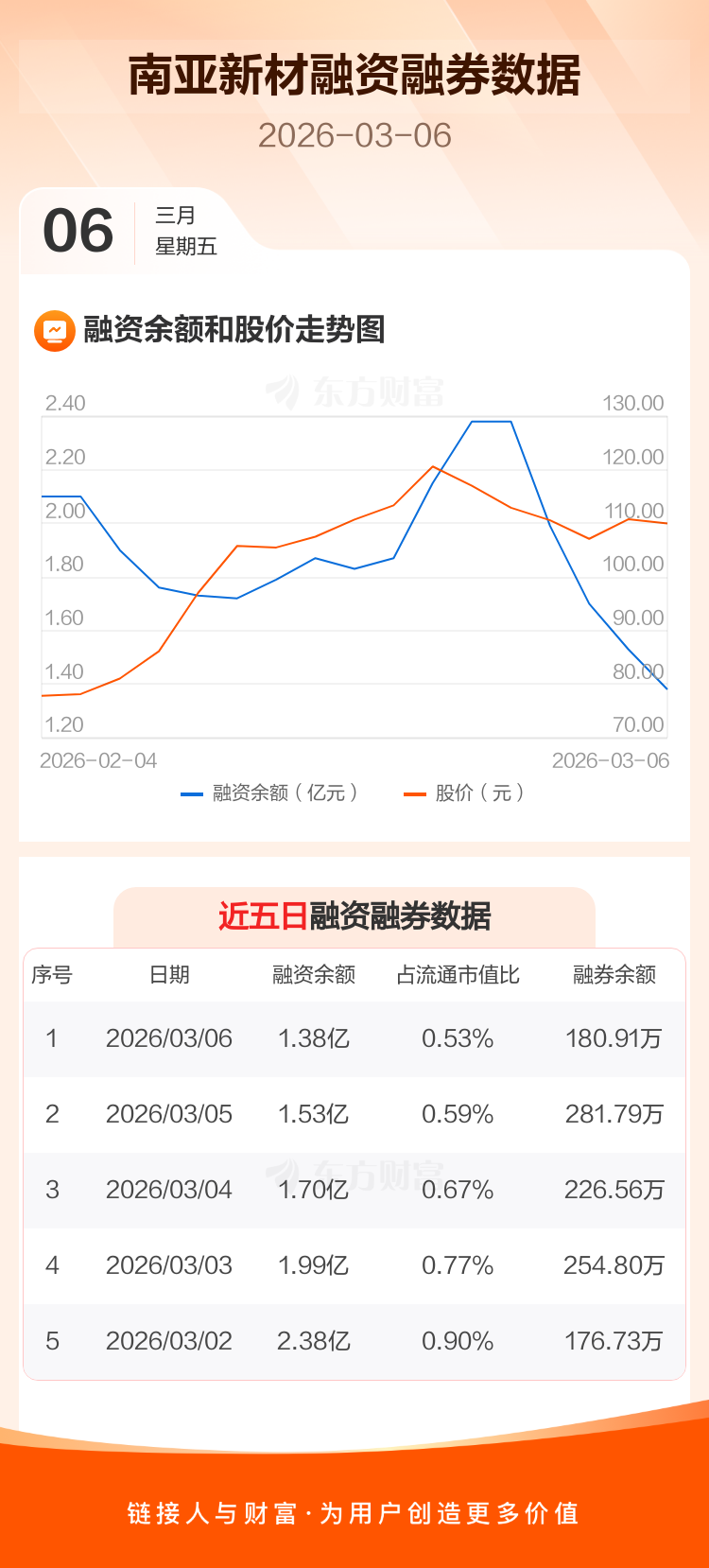 交易所最新数据显示,南亚新材于2026年3月6日获融资买入2093.78万元,融资偿还3619.82万元,当日融资净偿还1526.04万元。目前,该股融资余额1.38亿,占流通市值比例为0.53%。
