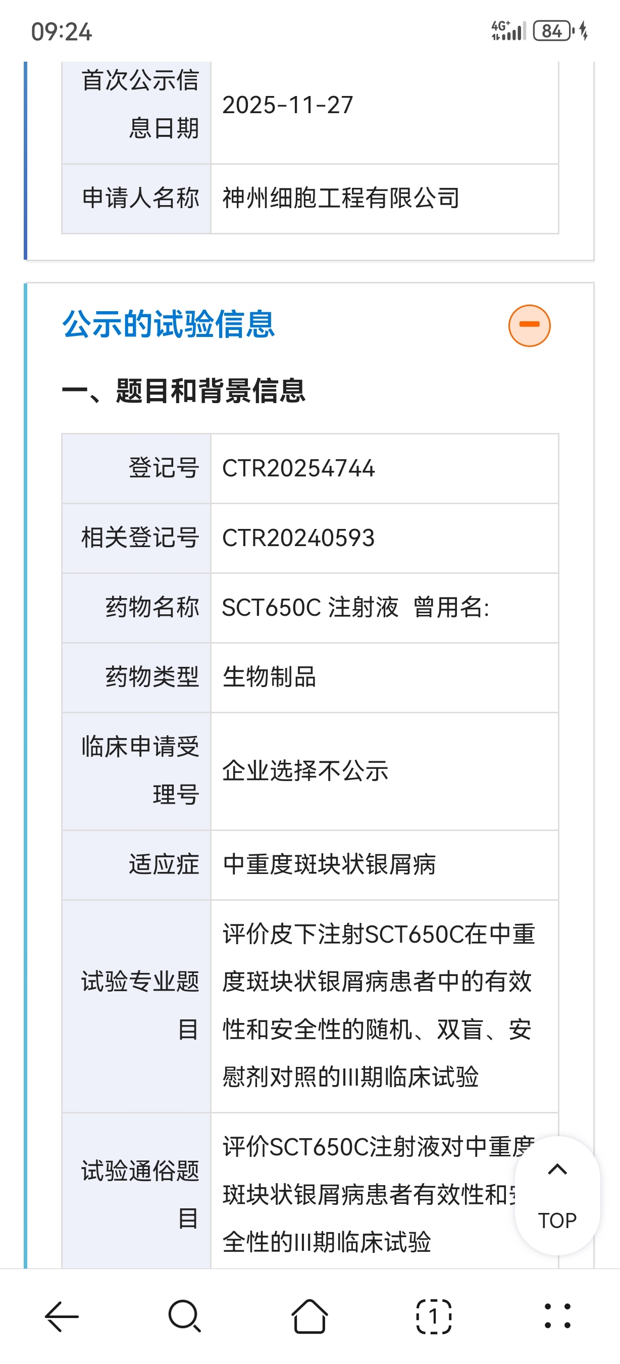 $神州细胞(SH688520)$ SCT650C中重度斑块状银屑病适应症临床三期,为什么不发公告