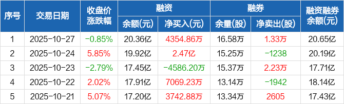 芯原股份:融资净买入4354.86万元,融资余额20.36亿元(10-27)