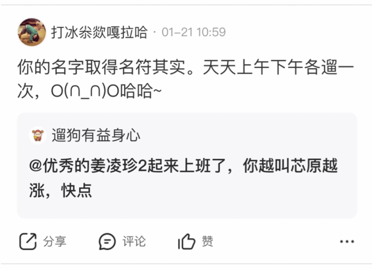 以前叫“优秀的姜凌珍2”,1月13号低位踏空芯原后开始疯狂刷屏唱空芯原