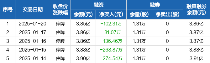 融资方面,当日融资买入0元,融资偿还102.31万元,融资净偿还102.31万元,连续9日净偿还累计2485.68万元。融券方面,融券卖出0股,融券偿还0股,融券余量1.31万股,融券余额69.52万元。融资融券余额合计3.86亿元。