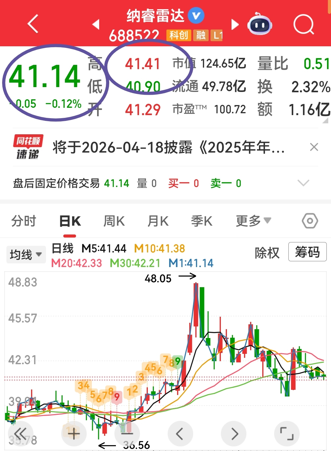 $纳睿雷达(SH688522)$ 主力牛批,41.14元收盘,盘中最高41.41元。