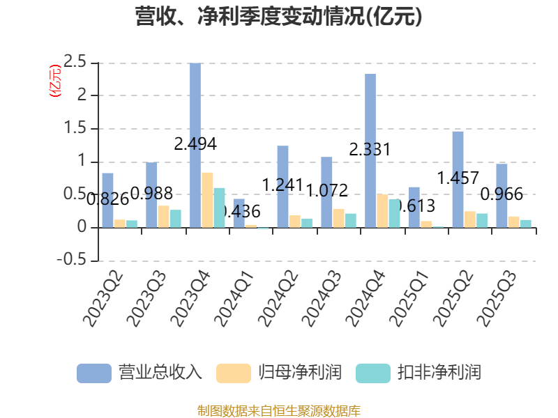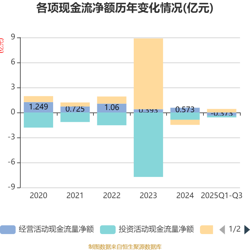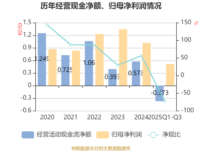 2025年前三季度,公司经营活动现金流净额为-3734.59万元,同比增加2616.02万元;筹资活动现金流净额4255.29万元,同比增加1.78亿元;投资活动现金流净额-2125.14万元,上年同期为-690.48万元。