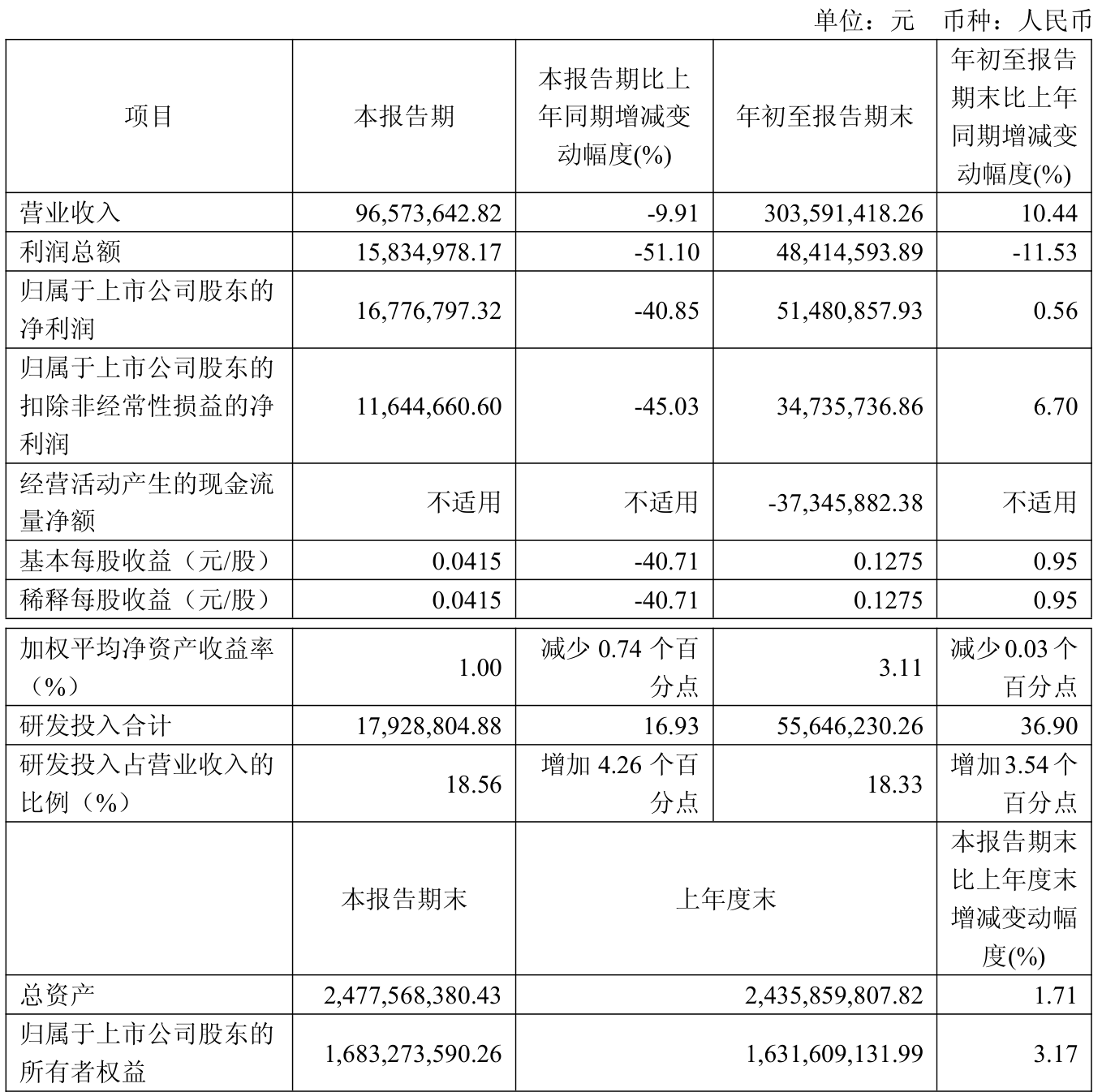 中证智能财讯航天环宇(688523)10月30日披露2025年第三季度报告。前三季度公司实现营业总收入3.04亿元,同比增长10.44%;归母净利润5148.09万元,同比增长0.56%;扣非净利润3473.57万元,同比增长6.70%;经营活动产生的现金流量净额为-3734.59万元,上年同期为-6350.61万元;报告期内,航天环宇基本每股收益为0.1275元,加权平均净资产收益率为3.11%。