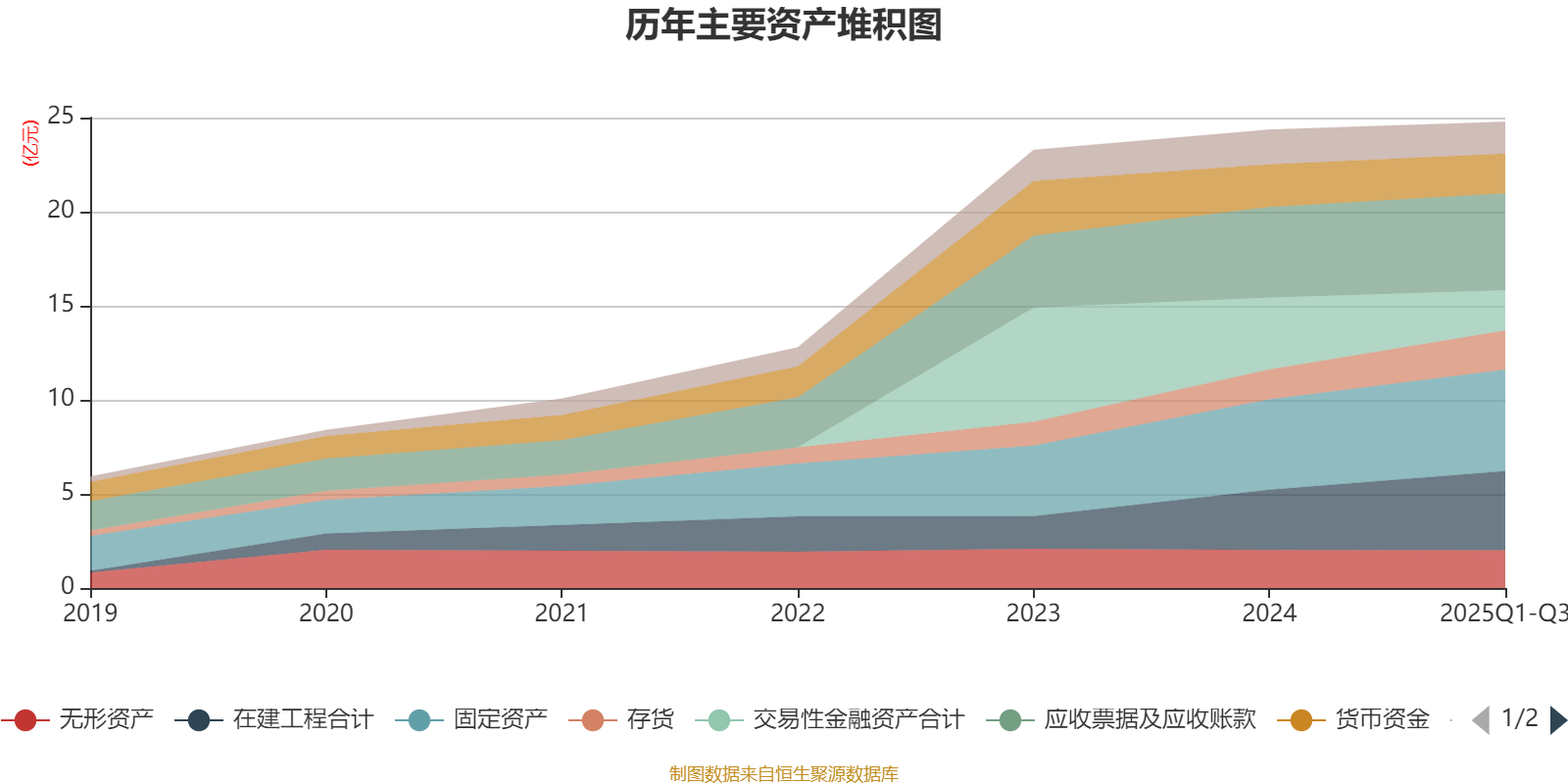 资产重大变化方面,截至2025年三季度末,公司交易性金融资产合计较上年末减少43.86%,占公司总资产比重下降7个百分点;在建工程合计较上年末增加31.57%,占公司总资产比重上升3.86个百分点;固定资产较上年末增加12.28%,占公司总资产比重上升2.05个百分点;存货较上年末增加29.62%,占公司总资产比重上升1.8个百分点。