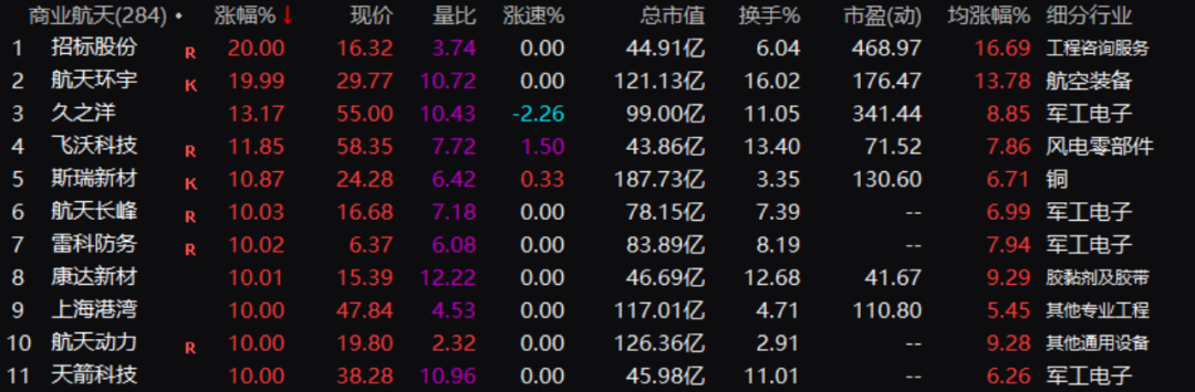 11月24日早盘,商业航天板块迎来大爆发,整个板块涨停或涨幅超过10%的个股一度达到11只。招标股份开盘2分钟涨停,航天环宇亦是20%涨停,航天长峰、航天动力等封板。