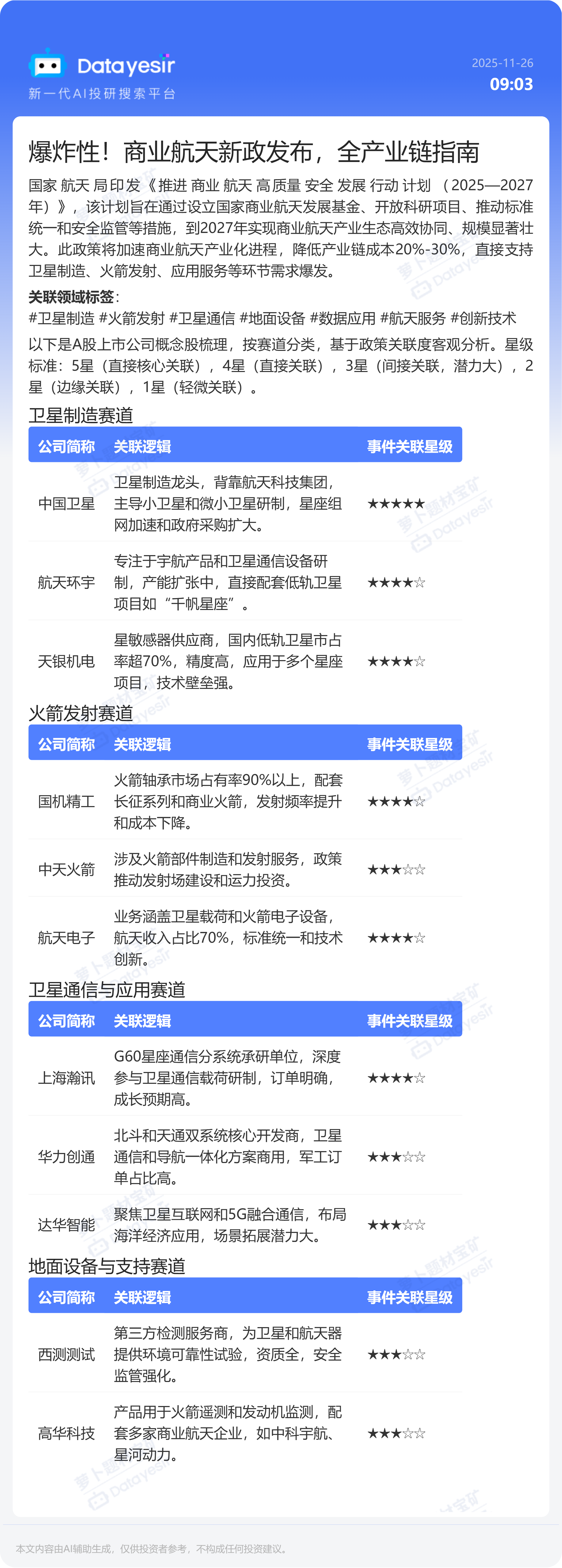 国家航天局印发《推进商业航天高质量安全发展行动计划(2025—2027年)》,该计划旨在通过设立国家商业航天发展基金、开放科研项目、推动标准统一和安全监管等措施,到2027年实现商业航天产业生态高效协同、规模显著壮大。