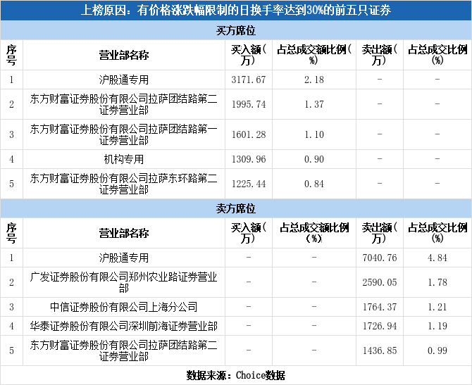 今日龙虎榜单上出现了沪股通的身影,占据了买一、卖一的位置,净卖出3869.09万,占当日成交总额的2.66%。除此之外沪股通还参与到了瑞可达、长光华芯、实达集团等8只个股中,其中5家呈现沪股通净买入,获净买入最多的是瑞可达,净买额为1.95亿元;3家呈现沪股通净卖出,遭净卖出最高的为长光华芯,净卖额为7264.94万元。