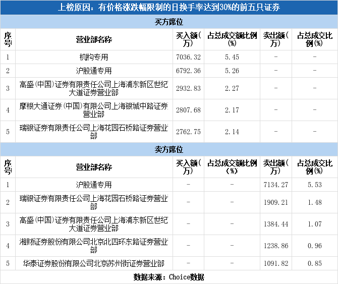 上交所2025年12月18日交易公开信息显示,航天环宇因属于有价格涨跌幅限制的日换手率达到30%的前五只证券而登上龙虎榜。航天环宇当日报收44.60元,涨跌幅为14.71%,换手率31.05%,振幅19.50%,成交额12.91亿元。