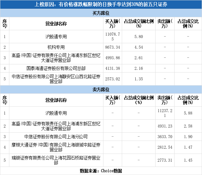 上交所2026年1月5日交易公开信息显示,航天环宇因属于有价格涨跌幅限制的日换手率达到30%的前五只证券而登上龙虎榜。航天环宇当日报收62.19元,涨跌幅为11.13%,换手率32.73%,振幅15.62%,成交额19.11亿元。