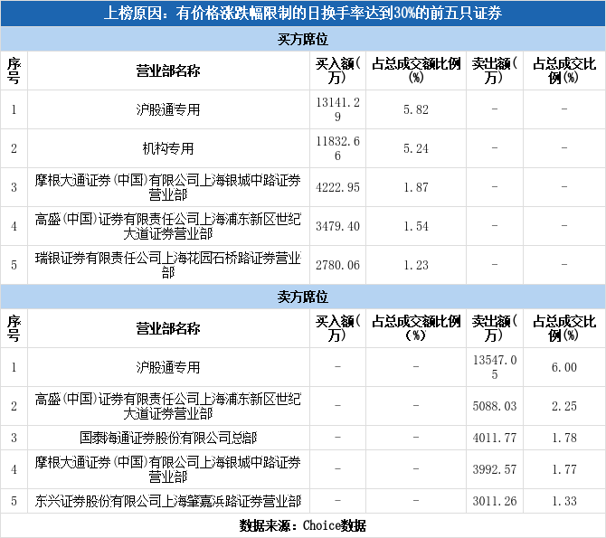今日龙虎榜单上出现了沪股通的身影,占据了买一、卖一的位置,净卖出405.76万,占当日成交总额的0.18%。除此之外沪股通还参与到了普冉股份、金海通、鄂尔多斯等17只个股中,其中11家呈现沪股通净买入,获净买入最多的是普冉股份,净买额为1.46亿元;6家呈现沪股通净卖出,遭净卖出最高的为鄂尔多斯,净卖额为5140.03万元。