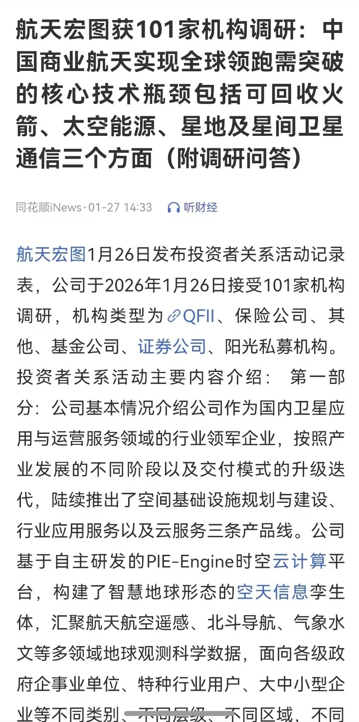 1月26号,有101家机构,同时趋之若鹜地去调研了科创板上的航天宏图。今天盘后,