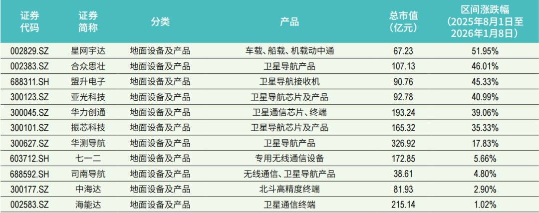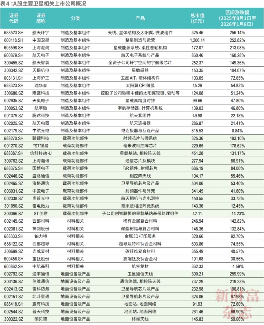 卫星基本组件,包括天线、星载能源系统、太阳翼、基本电子元器件等,以此为基础构成姿态控制、电源、推进、测控等关键模块,是保障卫星在轨运行的基础支撑单元。卫星制造就是将这些基本组件和载荷功能部件集成为整星。截至2026年1月8日(下同),14家卫星制造及基本组件上市公司总市值为4633亿元,平均市值331亿元,中国卫星市值最高,达1206亿元;2025年8月1日至2026年1月8日区间(下同)平均涨幅为104%,航天环宇(256%)、中国卫星(252%)、上海港湾(213%)、航天电子(160%)等公司股价表现突出。
