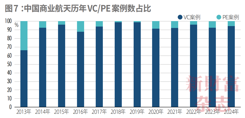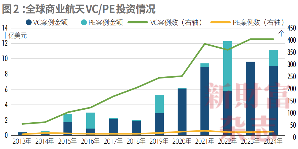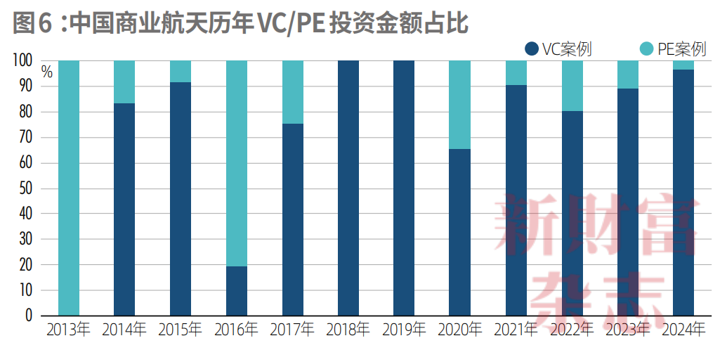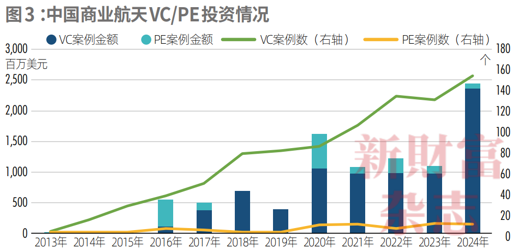 一级市场方面,根据行业数据平台Pitchbook资料,2013—2024年全球商业航天领域风险投资(VC)和私募股权(PE)投资的案例由53笔增长至420笔,金额由4亿美元增长至112亿美元,年复合增长率分别高达21%和35%(图3)。国内投资增长更为迅猛,VC和PE投资案例由3笔增长至163笔,金额由1700万美元增长至24亿美元,年复合增长率分别高达44%和57%(图4)。