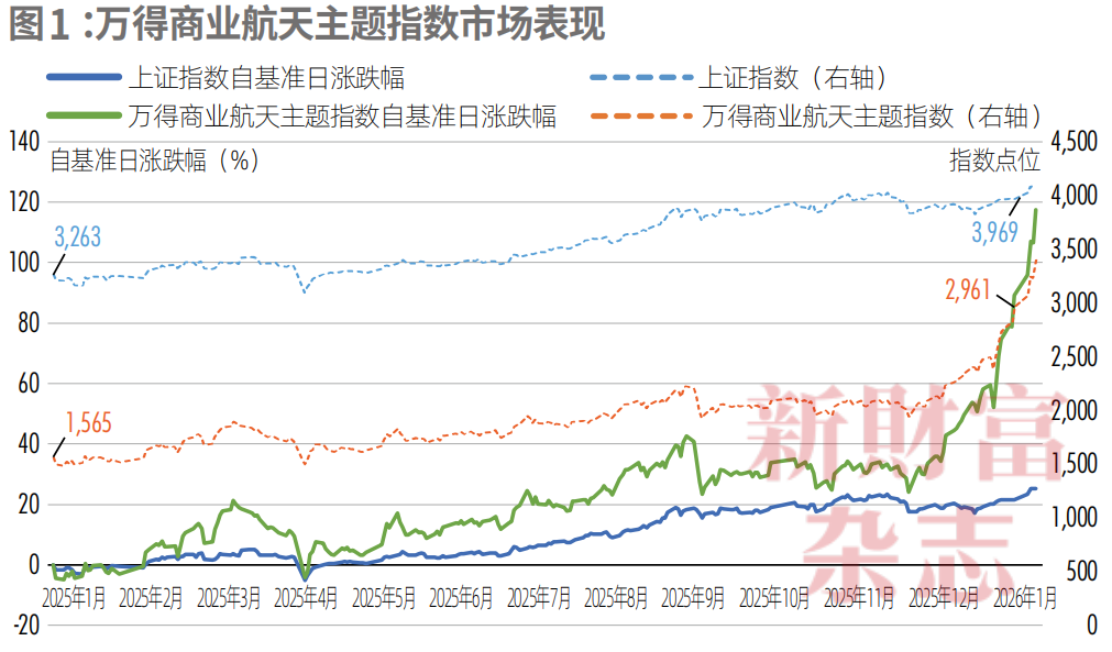 2025年全年,万得商业航天主题指数涨幅达89%,显著跑赢同期上证指数(涨幅为22%),尤其是在12月SpaceX传出上市消息、蓝箭航天申报被受理后,商业航天板块迎来“火箭式拉升”,指数当月涨幅达42%(图2)。中国卫星、斯瑞新材、再升科技等个股年内涨幅分别达到253%、342%、274%。