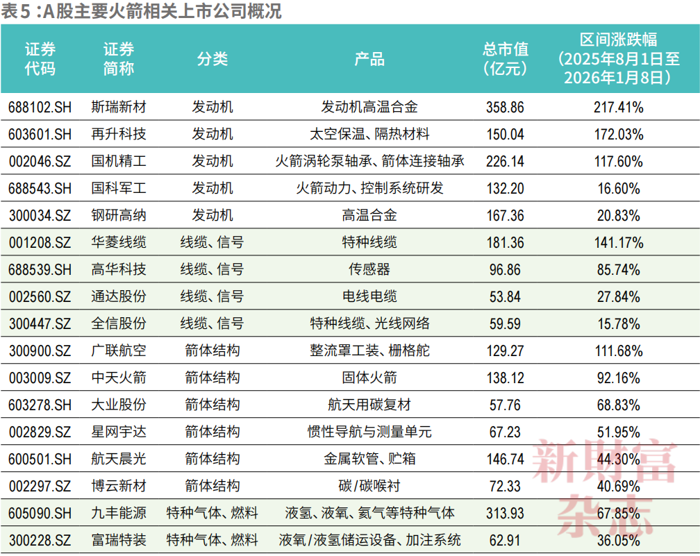 目前A股相关公司主要包括发动机、线缆信号、箭体结构、特种燃气/燃料四大类,总共17家左右,远少于卫星相关上市公司。除中天火箭一家提供小型固体整箭以外,其余均属于火箭零部件公司。