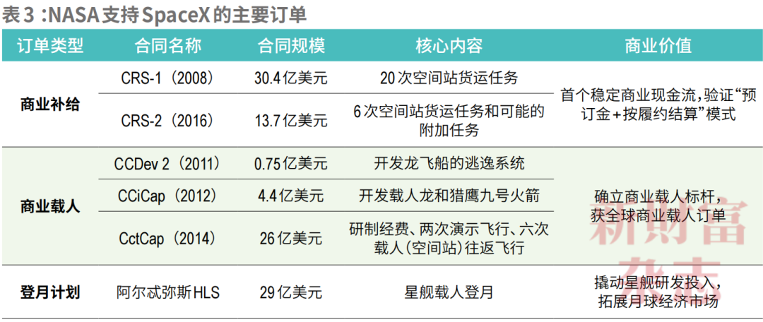 2002年,埃隆·马斯克拿出1亿美元,与动力系统工程师汤姆·穆勒(Tom Mueller)联合创立了SpaceX。经过20多年的发展,SpaceX成为全球商业航天的头号巨头,而这离不开NASA给予的技术和订单支持。例如,SpaceX的梅林发动机是在NASA的FASTRAC发动机基础上研制的;龙飞船防热罩采用的新型隔热材料PICA-X能承受近2000℃的高温,是和NASA阿莫斯研究中心共同研发的。同时,NASA提供了商业补给(CRS)、商业载人(CCP)、载人登月(HLS)合计超100亿美元的订单,并且按里程碑付费(表3)。这些技术支持为SpaceX构建了“从0到1”的能力底座,大规模订单则提供了“从1到N”的产品市场,两者结合使SpaceX在15年内实现从猎鹰1号到星舰的技术飞跃,这种“技术赋能+订单牵引+市场化运作”的合作范式,为各国发展商业航天提供了重要参考。