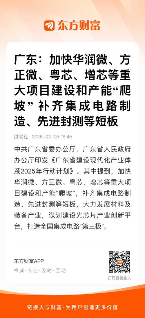中共广东省委办公厅、广东省人民政府办公厅印发《广东省建设现代化产业体系2025年行动计划》。其中提到,加快华润微、方正微、粤芯、增芯等重大项目建设和产能“爬坡”,补齐集成电路制造、先进封测等短板,大力发展材料及装备产业,谋划建设光芯片产业创新平台,打造全国集成电路“第三极”。