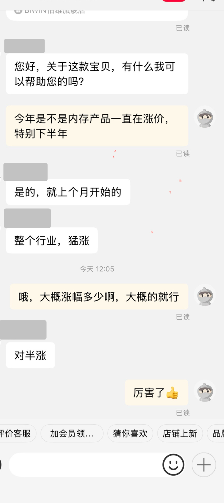 市场的真实反馈,和天猫某店的对话,我询的是佰维的产品