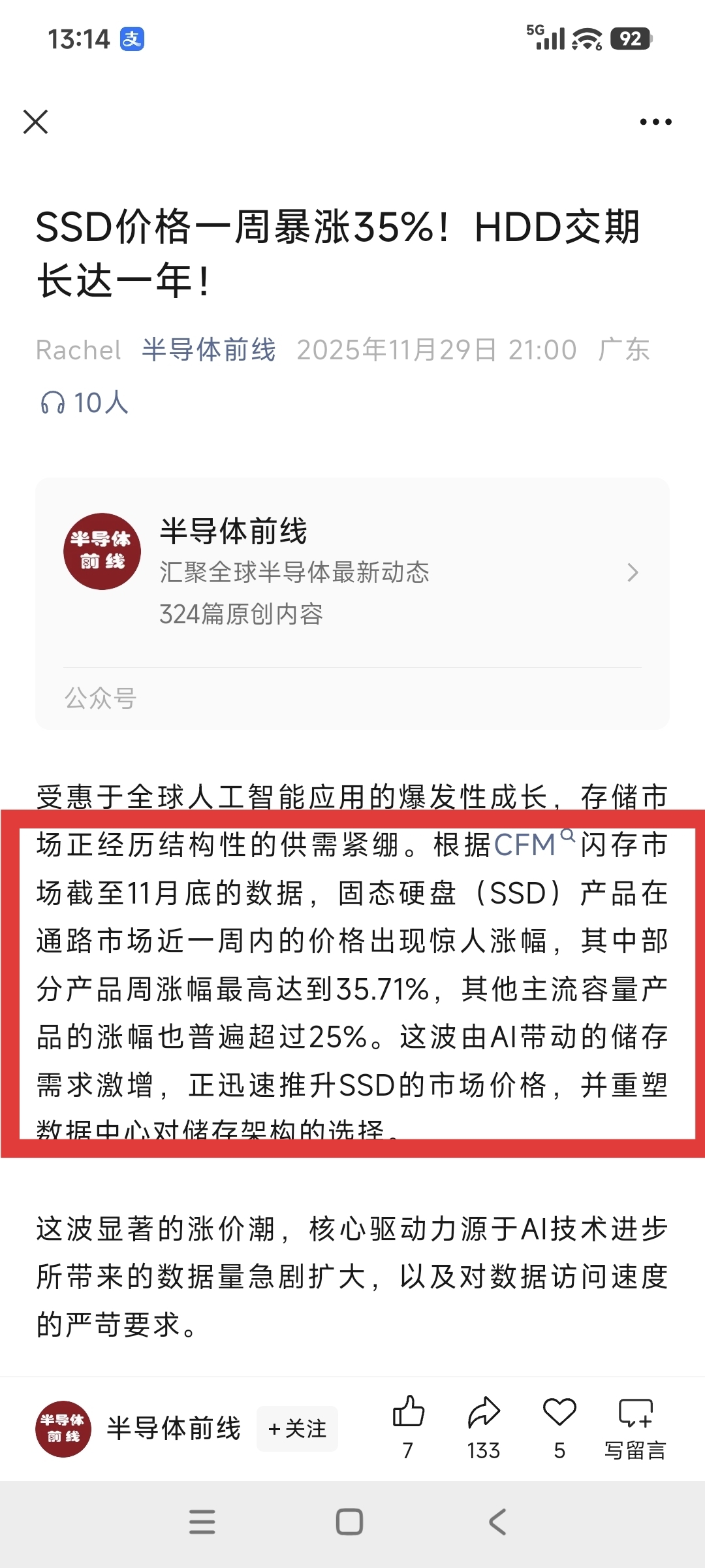 根据CFM闪存市场截至11月底的数据,固态硬盘(SSD)产品在通路市场近一周内的价格出现惊人涨幅,其中部分产品周涨幅最高达到35.71%,其他主流容量产品的涨幅也普遍超过25%。这波由AI带动的储存需求激增,正迅速推升SSD的市场价格,并重塑数据中心对储存架构的选择。