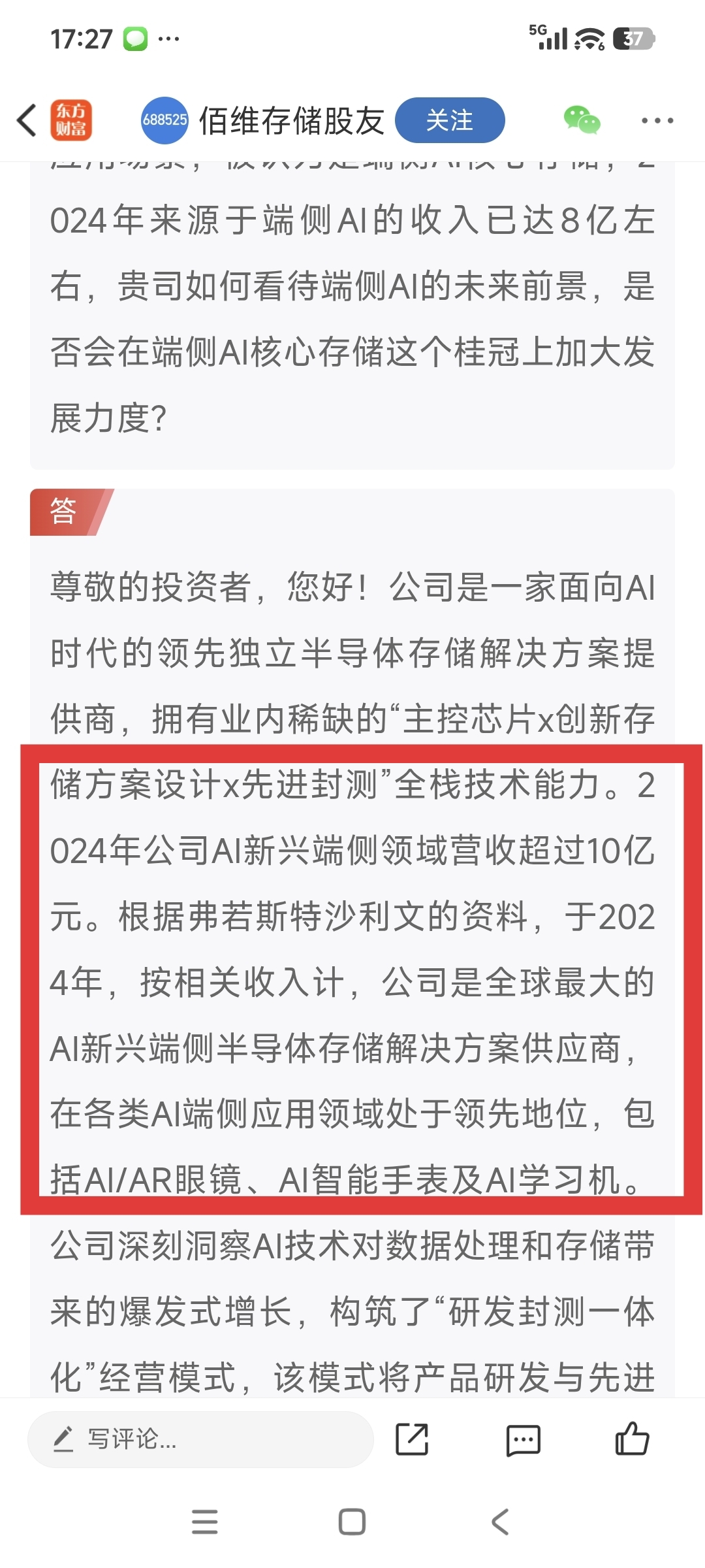 2024年佰维AI新兴端侧领域营收超过10亿元。根据弗若斯特沙利文的资料,2024年按相关收入计,公司是全球最大的AI新兴端侧半导体存储解决方案供应商,在各类AI端侧应用领域处于领先地位,包括Al/AR眼镜、AI智能手表及AI学习机。
