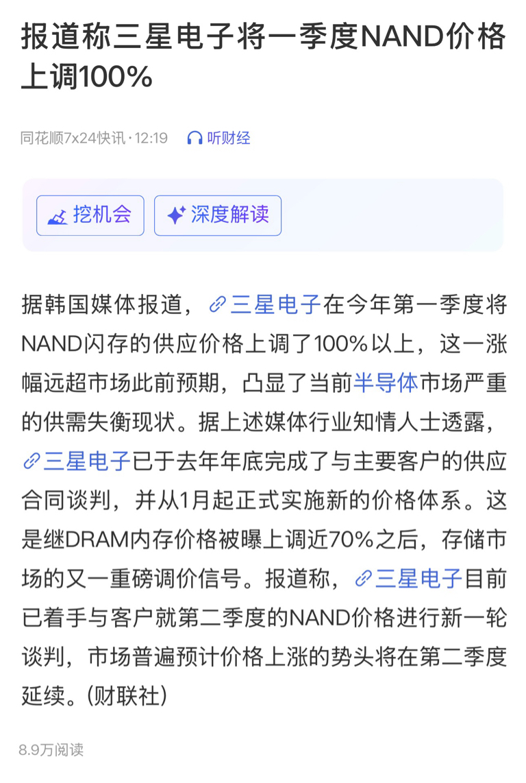 超预期涨价三星电子在今年第一季度将NAND闪存的供应价格上调了100%以上