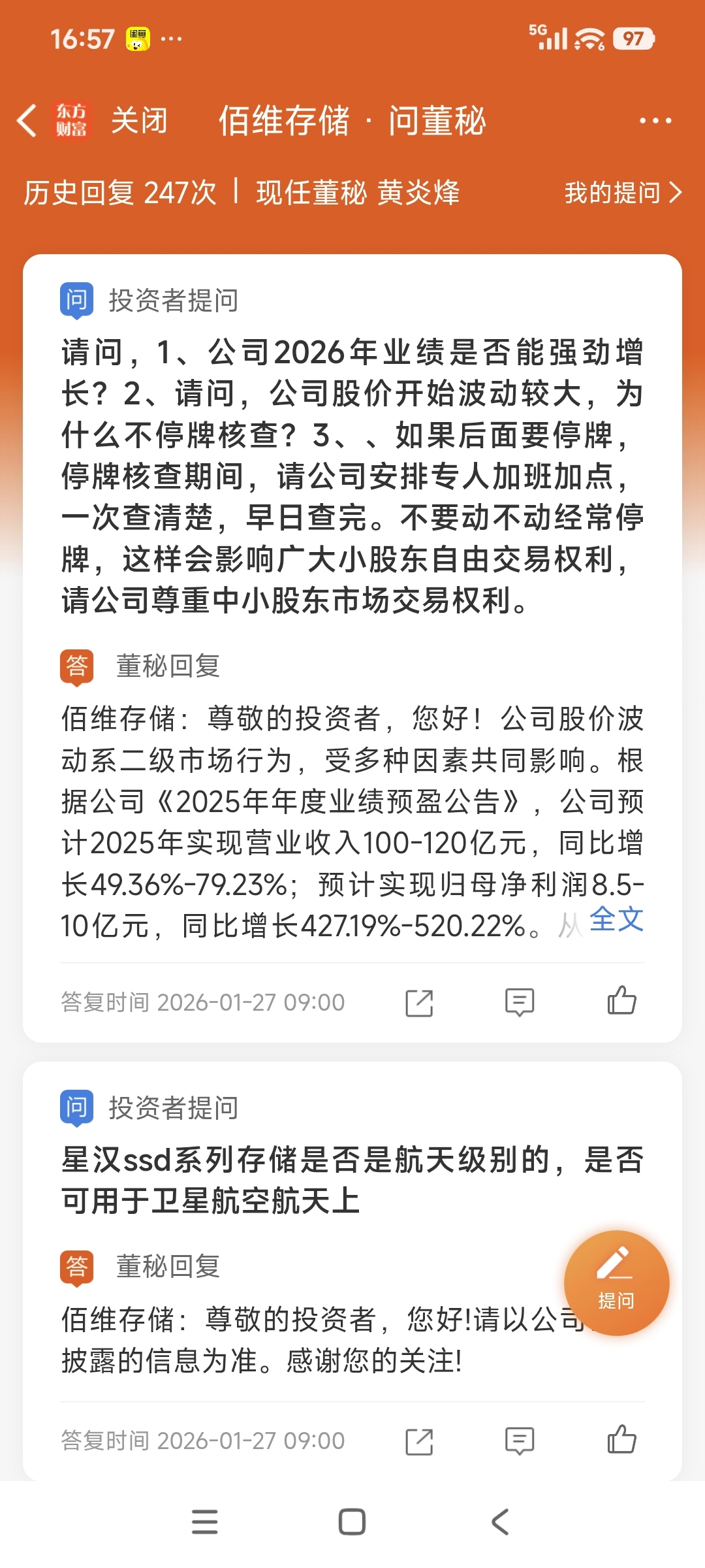 互动很多问题都是蠢到没边的,比如问佰维为什么不停牌核查的,佰维又没有在10个交易日内(含10个交易日)涨幅翻倍,停啥牌,连最基本的交易规则都不懂就敢对董秘指手画脚