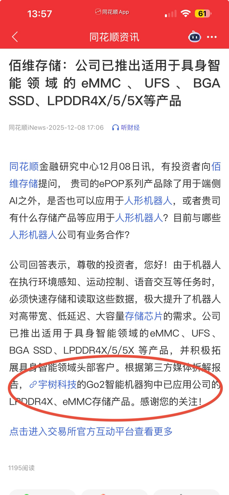 $佰维存储(SH688525)$ 公司去年12月8号的回复就已经确认了,给宇树供货早都不是新鲜事了
