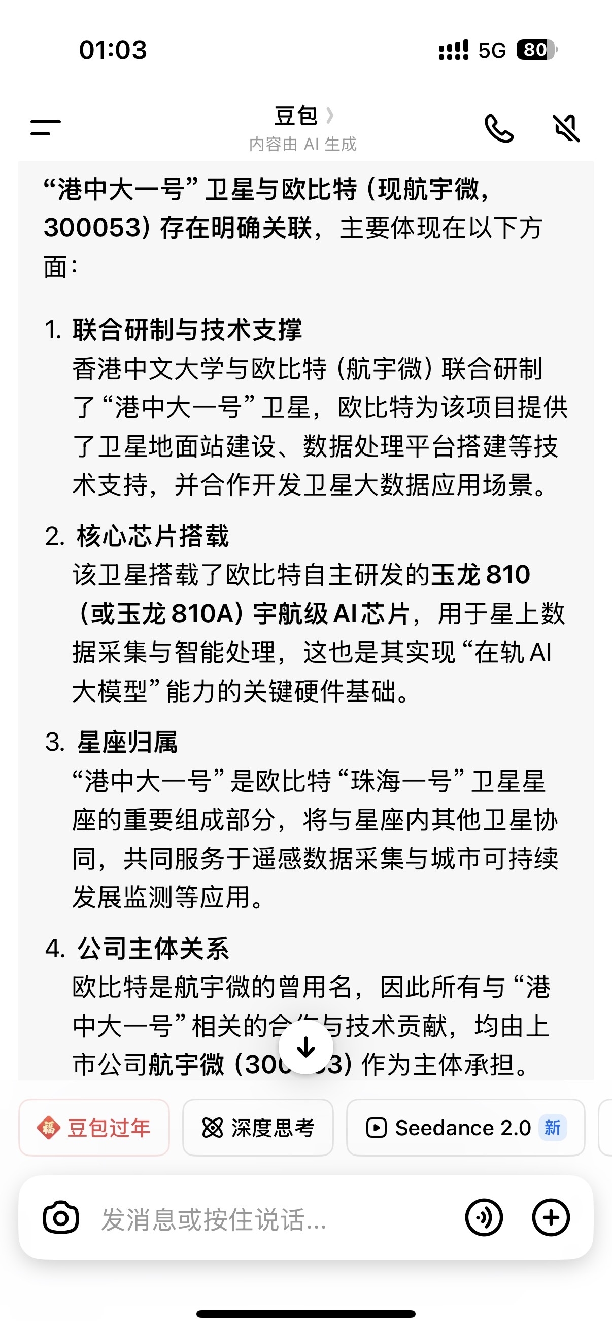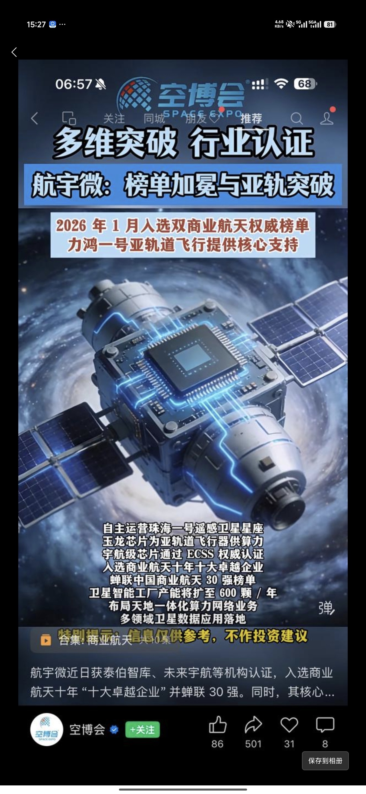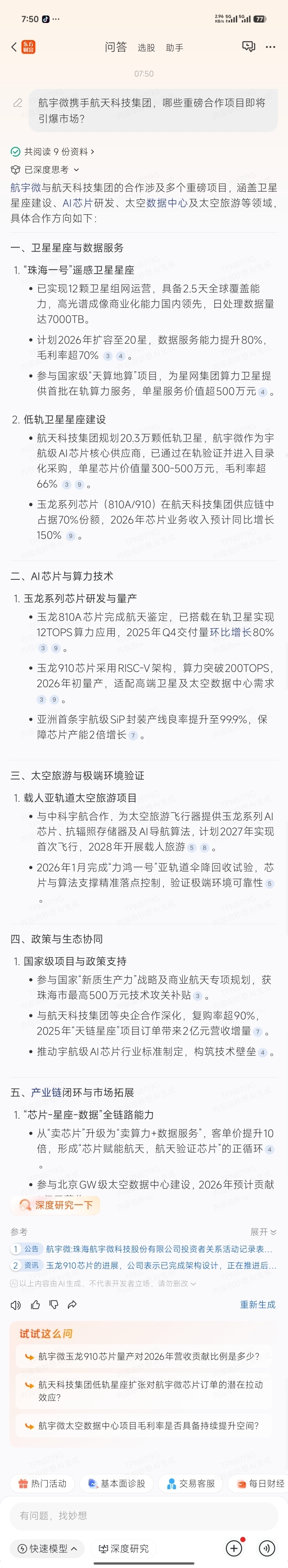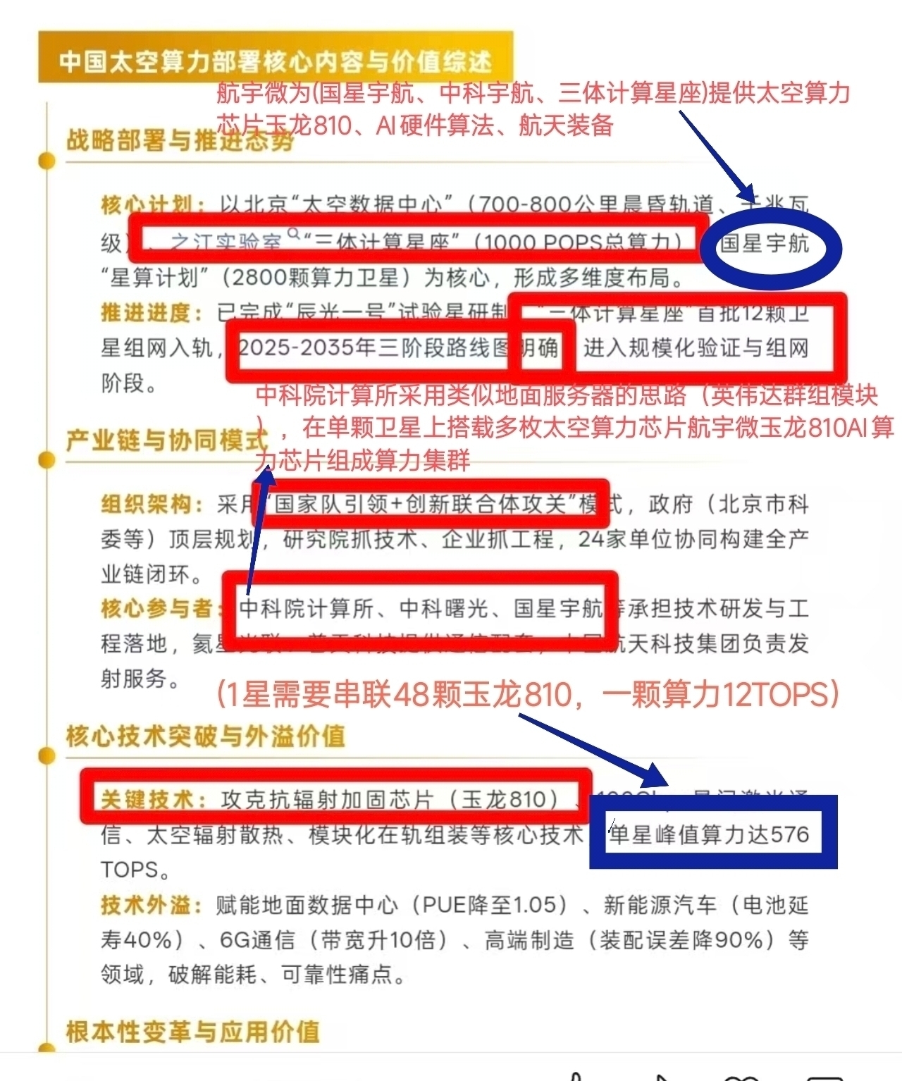 中国星链$佰维存储(SH688525)$$华自科技(SZ300490)$$洲际油气(SH600759)$:国内遥感卫星数量遥感技术第一-航宇微300053值一个涨停:全球唯一太空算力太空英伟达在轨验证合格卫星AI芯片:航宇微,在手意向订单20亿航宇微与国家星网(即“GW星座”)存在明确的业务供应关系。以下是双方关系的具体细节:1. 核心供应关系:宇航芯片航宇微是国家星网工程中宇航级芯片的重要供应商。* 供应产品: 主要是其自主研发的“玉龙”系列AI芯片(如玉龙810A)以及配套的SiP(系统级封装)模块。* 应用领域: 这些芯片被用于星网卫星的在轨智能处理系统。在低轨卫星组网中,需要对海量数据进行实时处理,航宇微的芯片提供了这种“太空算力”,能够实现数据的星上压缩、识别和分发。2. 订单实锤:在手订单明确与一些仅处于概念或传闻阶段的合作不同,航宇微与国家星网的合作已有实质性的订单支持。* 订单规模: 根据截至2026年初的市场数据,航宇微针对国家星网(GW)的在手订单金额约为3亿元人民币。* 交付计划: 相关产品(玉龙810系列芯片及SiP模块)计划在2026年第二季度至第四季度分批交付。* 验证情况: 其玉龙810A芯片已通过天舟六号货运飞船在中国空间站进行了在轨验证,运行零故障,具备了进入国家级重大工程供应链的资质。3. 产业链地位在国家星网(GW星座)的庞大产业链中,航宇微占据的是“核心元器件”的环节。* 不可替代性: 由于太空环境的特殊性(高辐射、极端温度),普通地面芯片无法直接使用。航宇微是国内少数能够提供高性能、抗辐照AI芯片的商业公司,打破了国外垄断。* 全链条闭环: 除了供应芯片给星网,航宇微自身也运营“珠海一号”星座,具备“芯片+星座+数据处理”的全链条能力,这使其在与国家星网的协同(如数据分发、天地一体化网络)方面具有独特优势。总结:航宇微不仅是国家星网(GW)的核心供应商,而且已经锁定了数亿元的实质性订单。随着国家星网在2026年及以后的密集组网发射,这种供应关系预计将持续深化。