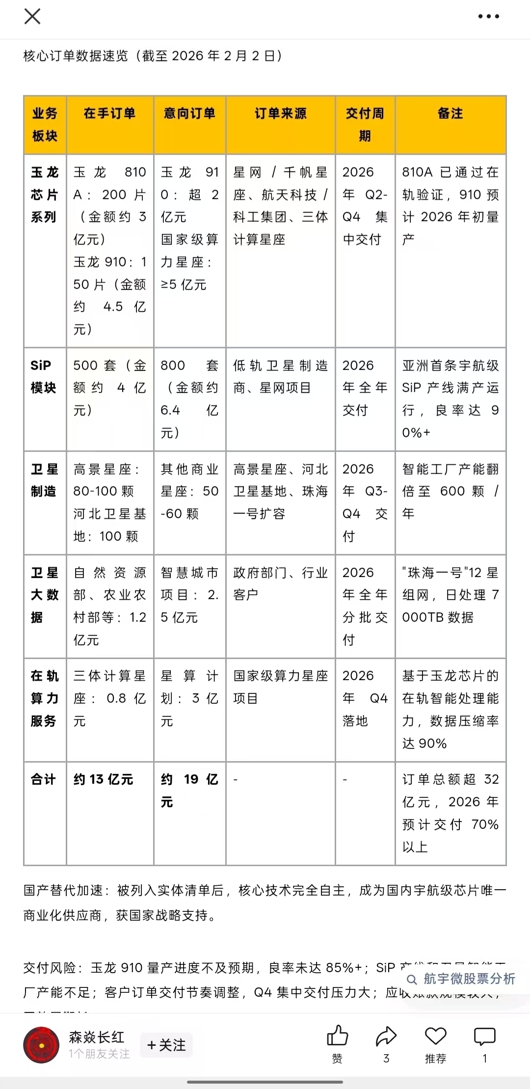 航宇微300053太空算力在手订单13亿意向订单16亿,订单来源:国家星网,千帆星座,航天科技,航天科工,国家河北卫星基地,国家
