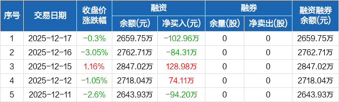 秦川物联:融资净偿还102.96万元,融资余额2659.75万元(12-17)