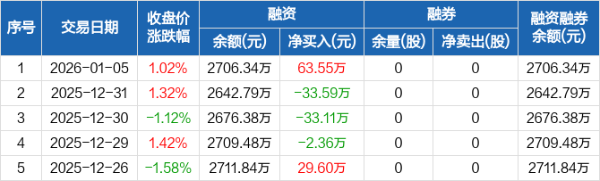 秦川物联:融资净买入63.55万元,融资余额2706.34万元(01-05)