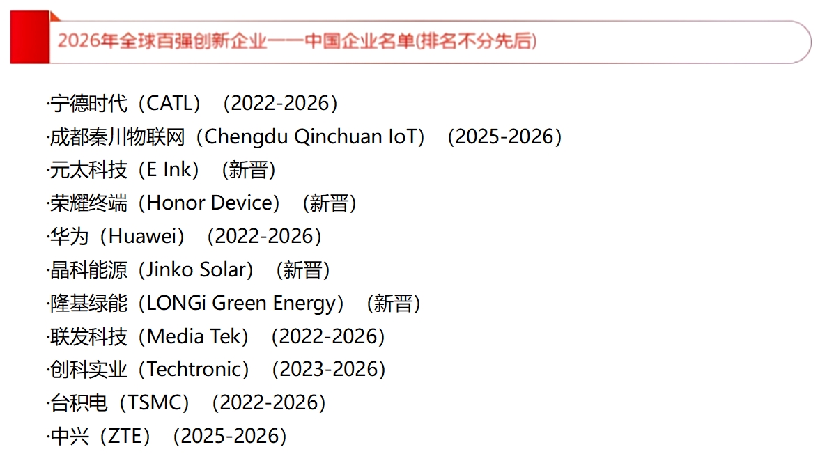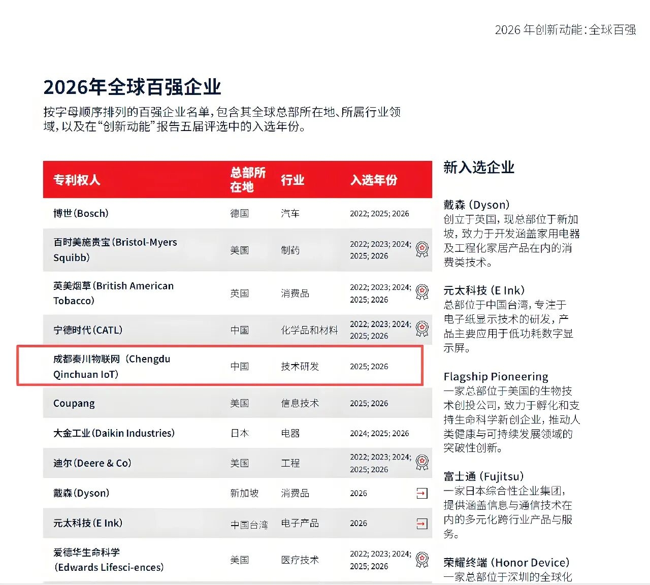 秦川物联荣登“2026年创新动能:全球百强”成都秦川物联网科技股份有限公司202