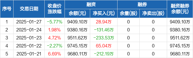 豪森智能:融资净买入28.94万元,融资余额9409.1万元(01-27)