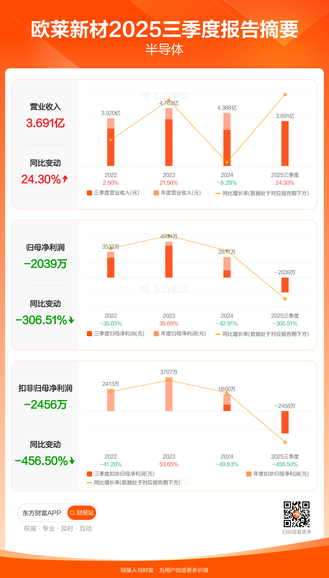 欧莱新材10月31日发布2025年三季报显示,公司前三季实现营业收入3.69亿元,同比增长24.30%;归母净利润-2039.18万元;扣非归母净利润-2456.23万元。