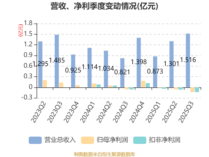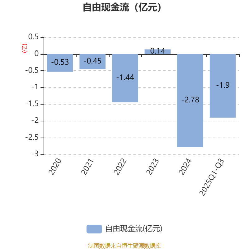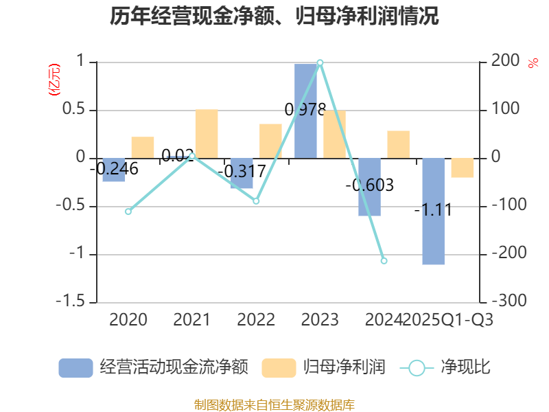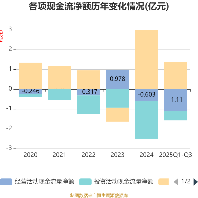2025年前三季度,公司经营活动现金流净额为-1.11亿元,同比减少3855.87万元;筹资活动现金流净额1.37亿元,同比减少1.16亿元;投资活动现金流净额-4680.18万元,上年同期为-1.74亿元。