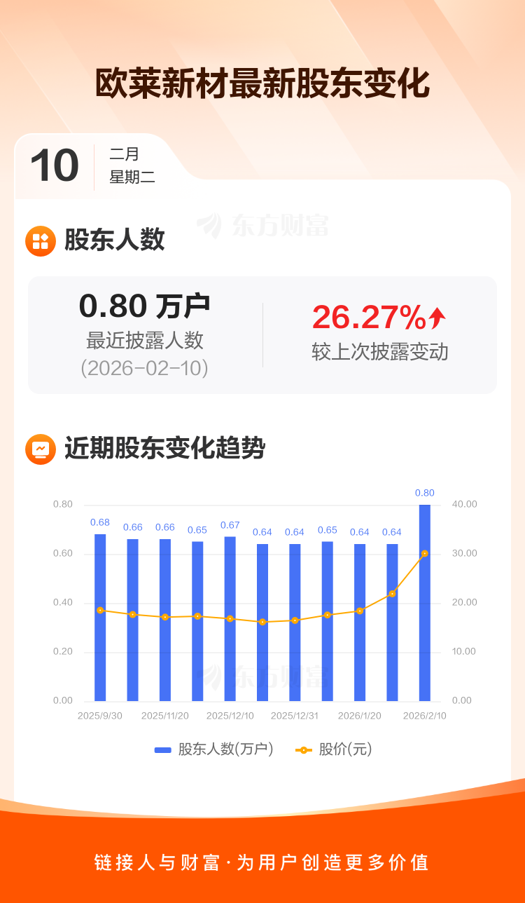 欧莱新材:截至2月10日最新股东户数8032户,较上期增加26.27%