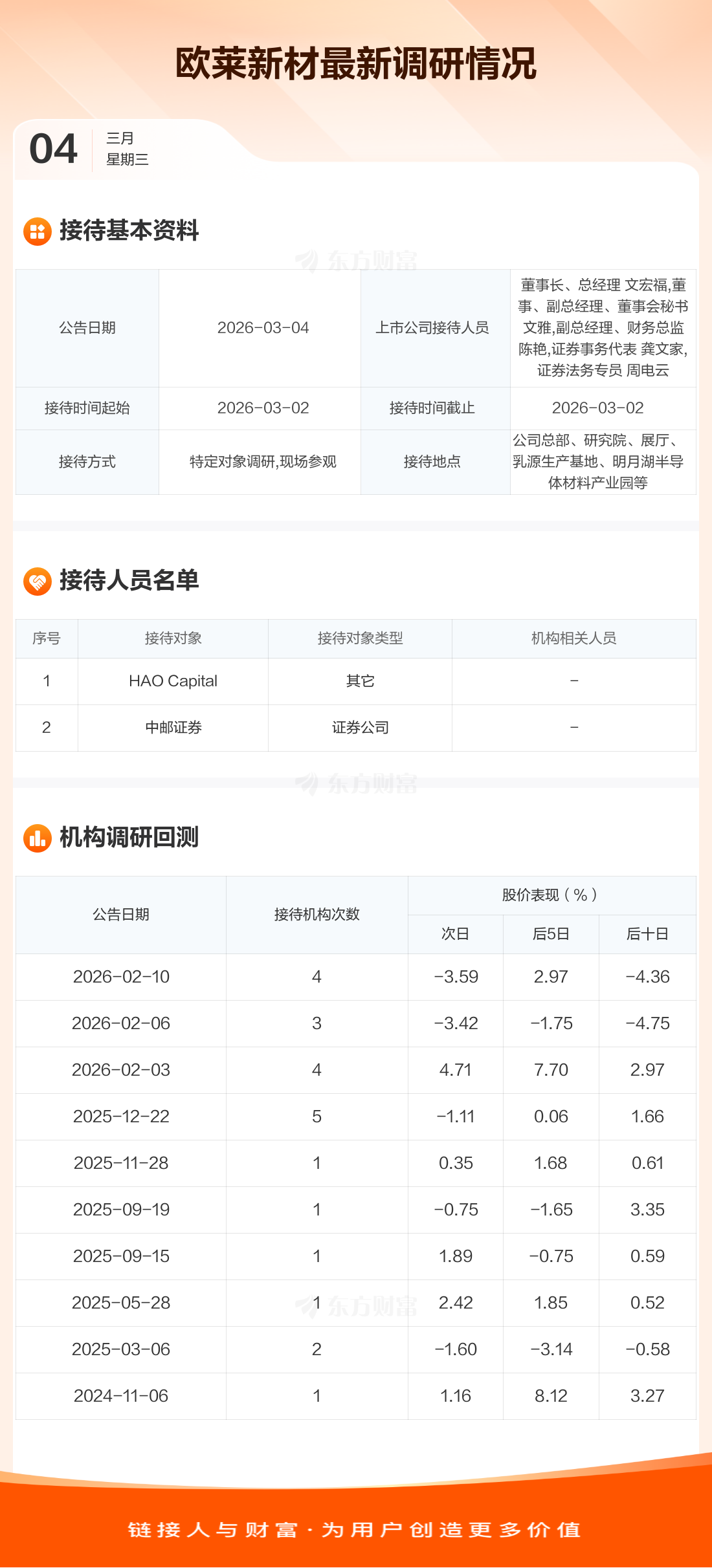 欧莱新材3月4日公告称,3月2日接待HAO Capital等2家机构调研。接待人员包括董事长、总经理 文宏福,董事、副总经理、董事会秘书 文雅,副总经理、财务总监 陈艳,证券事务代表 龚文家,证券法务专员 周电云。