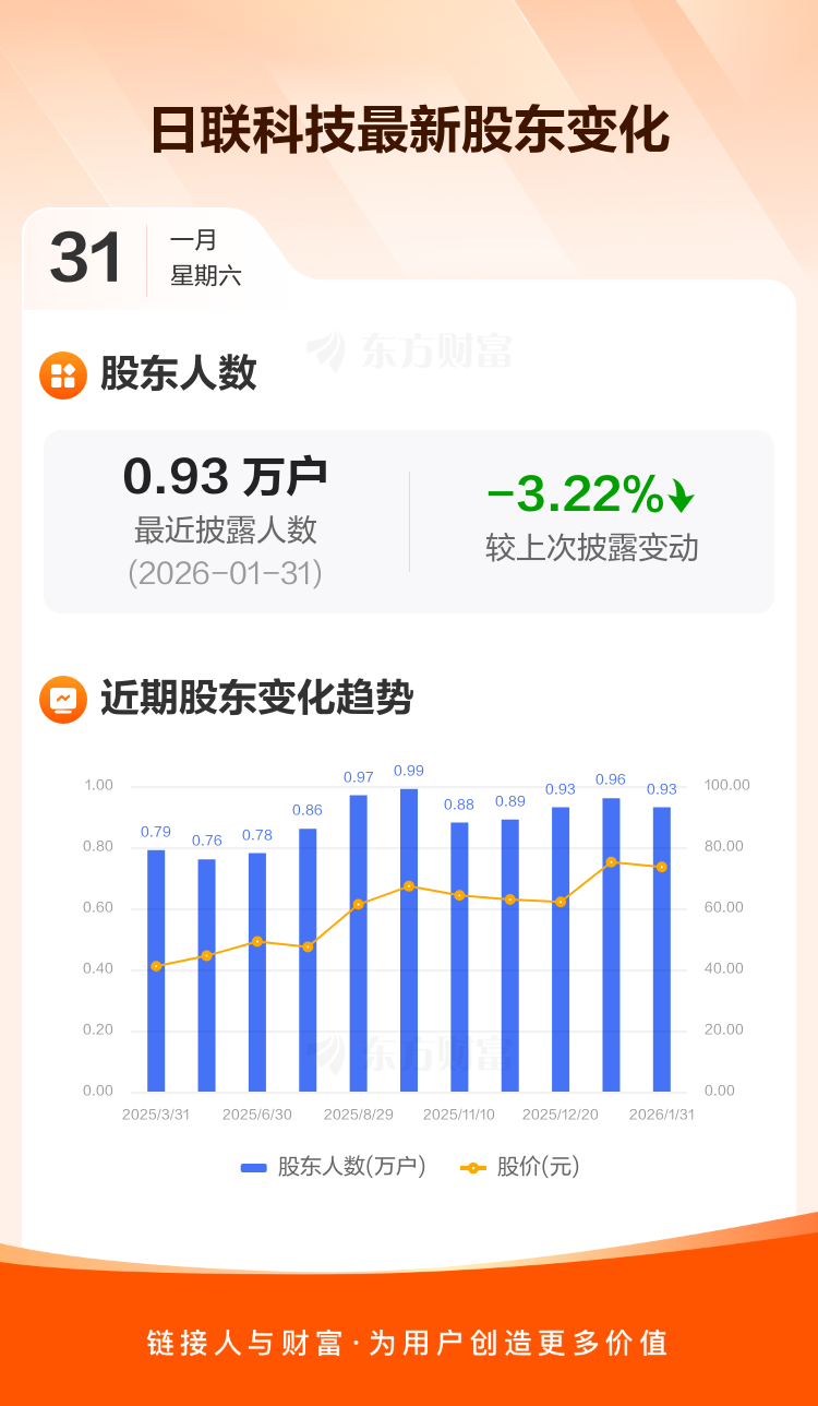 日联科技最新披露数据显示,截至1月31日公司股东户数为9285户,较上期(2026年1月20日)减少309户,降幅为3.22%。户均持有流通股数量由上期的1.11万股上升至1.15万股,户均持股金额由上期的83.70万元增加至84.67万元。