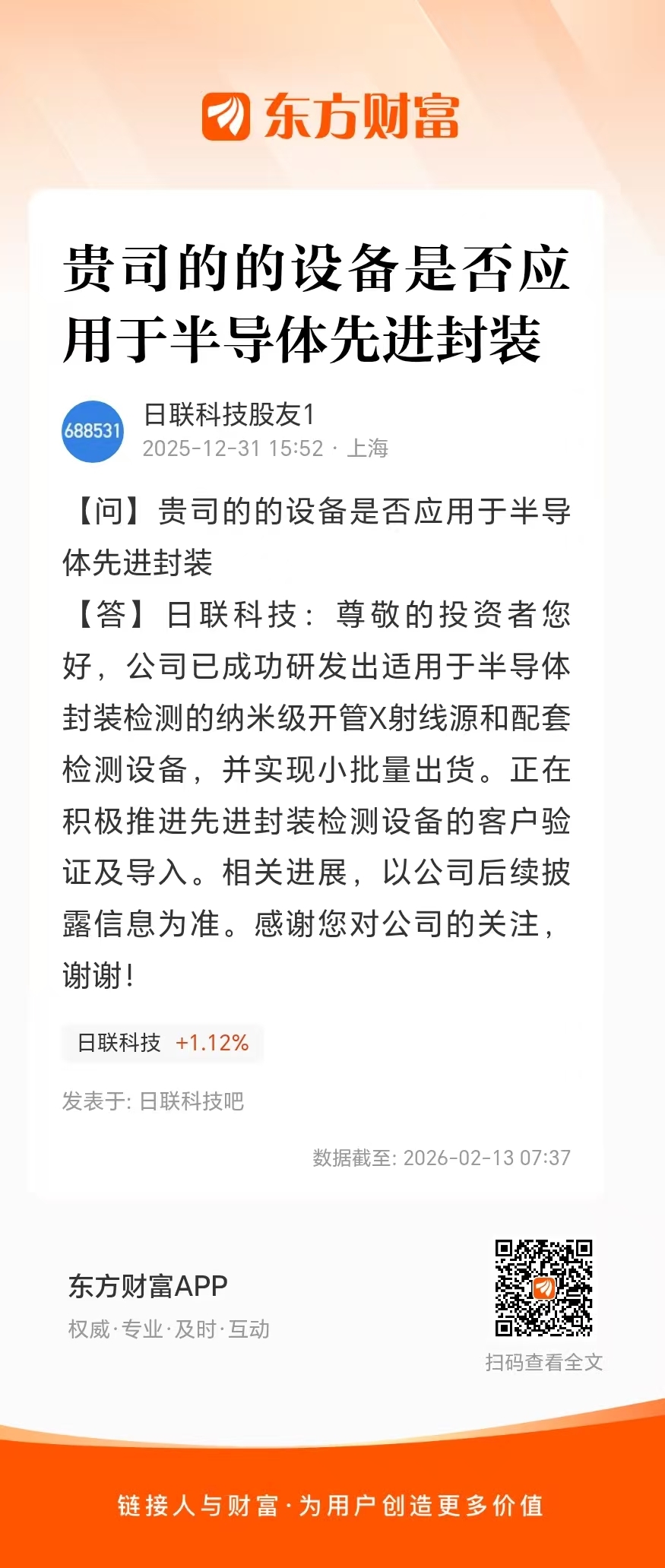 $微导纳米(SH688147)$ 半导体设备需求旺盛$日联科技(SH688531)$ 半导体设备占营收的一半,并且收购了半导体设备公司ssti,ssti和一半以上的全球半导体二十强均有业务往来,且纳米级开管射线源在长鑫存储$华峰测控(SH688200)$