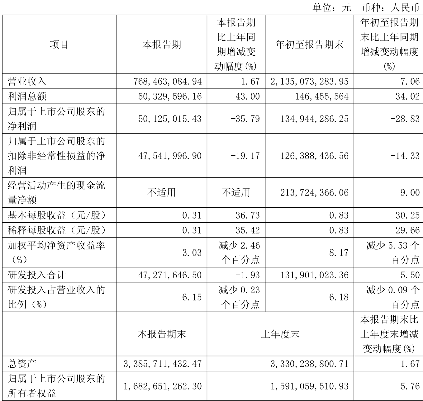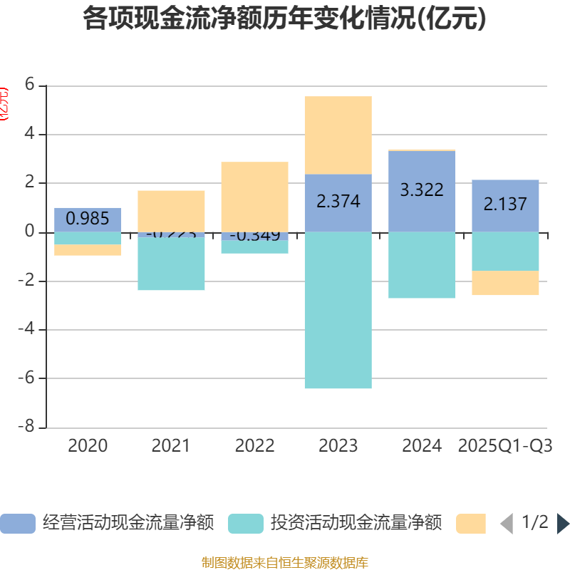 2025年前三季度,公司经营活动现金流净额为2.14亿元,同比增长9%;筹资活动现金流净额-9891.21万元,同比减少6355.88万元;投资活动现金流净额-1.59亿元,上年同期为-2.44亿元。