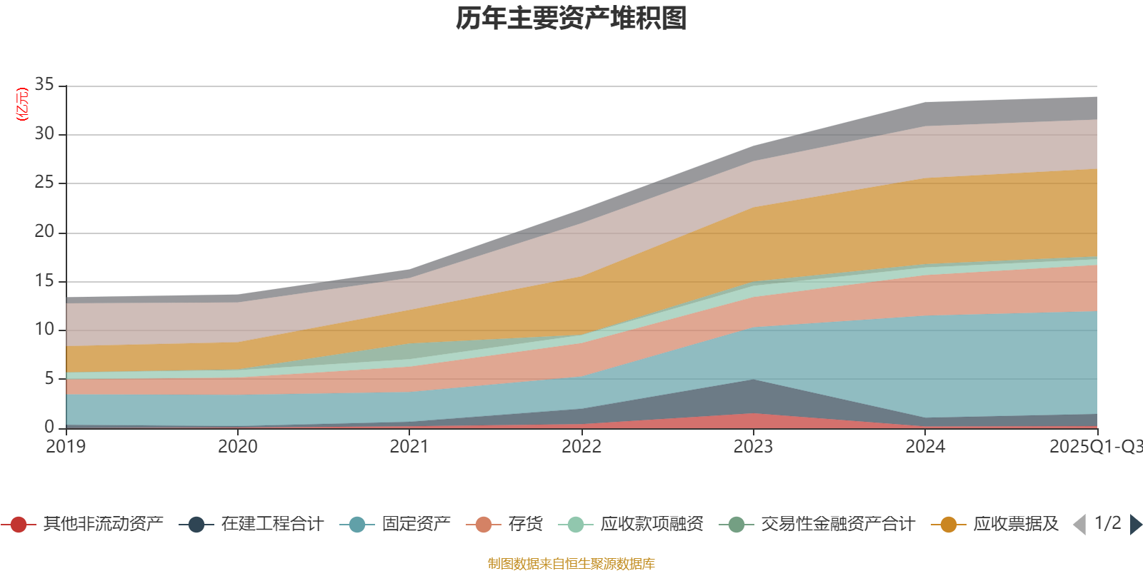 资产重大变化方面,截至2025年三季度末,公司存货较上年末增加14.2%,占公司总资产比重上升1.53个百分点;其他流动资产较上年末减少53.72%,占公司总资产比重下降1.3个百分点;货币资金较上年末减少5.51%,占公司总资产比重下降1.13个百分点;在建工程合计较上年末增加38.2%,占公司总资产比重上升0.96个百分点。