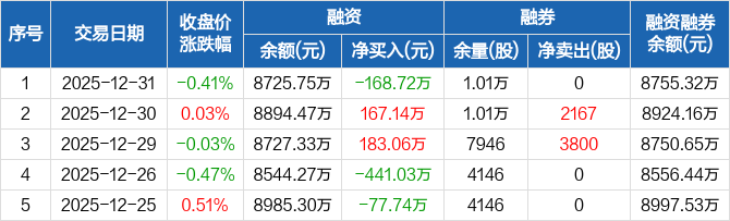 上声电子:融资净偿还168.72万元,融资余额8725.75万元(12-31)