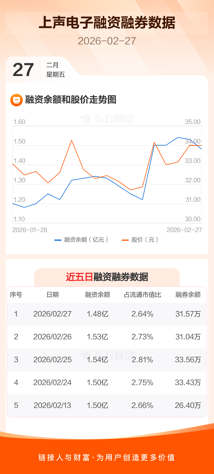 交易所最新数据显示,上声电子于2026年2月27日获融资买入910.14万元,融资偿还1426.33万元,当日融资净偿还516.19万元。目前,该股融资余额1.48亿,占流通市值比例为2.64%。